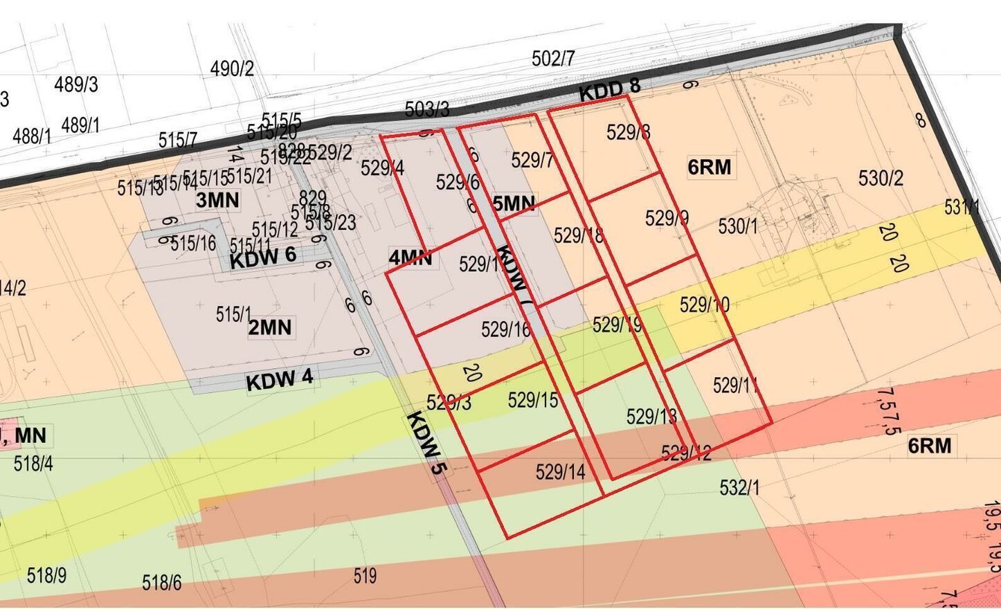 a) w odległości 6m od dróg oznaczonych w planie symbolem KDW 4, KDW 5, KDW 6, KDW 7 i KDD 8;