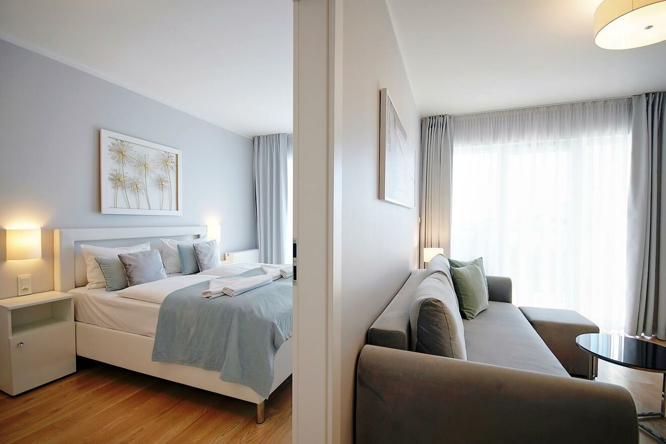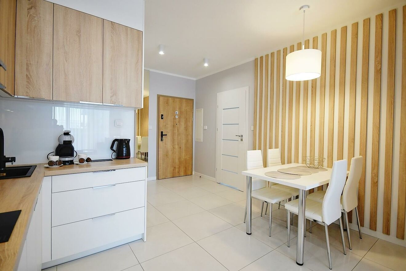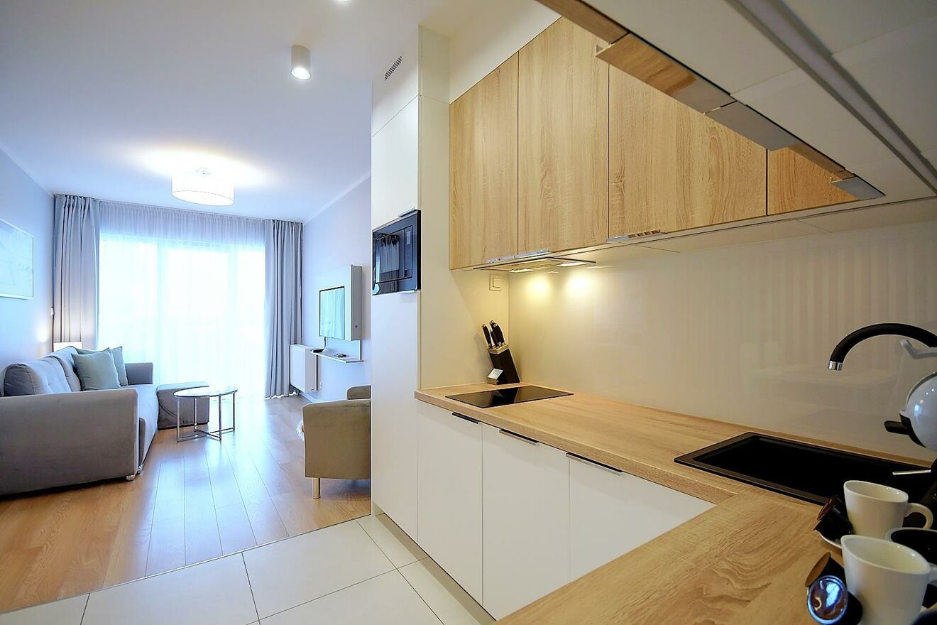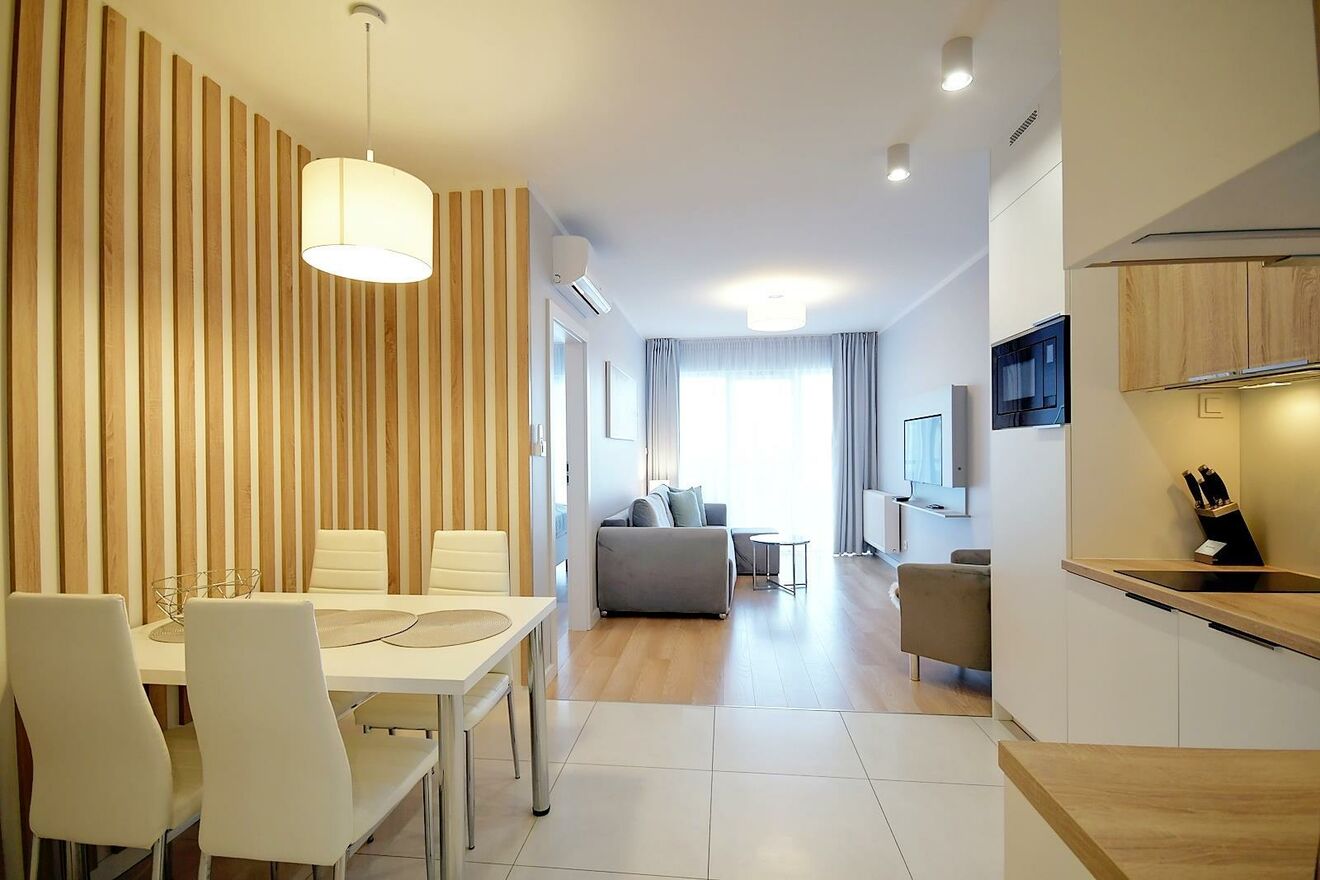 Apartament jest bardzo funkcjonalny i nowocześnie wykończony. Sprzedawany jest z meblami i kompletnym wyposażeniem, co pozwoli nowym właścicielom na szybkie zamieszkanie lub czerpanie zysków z wynajmu.