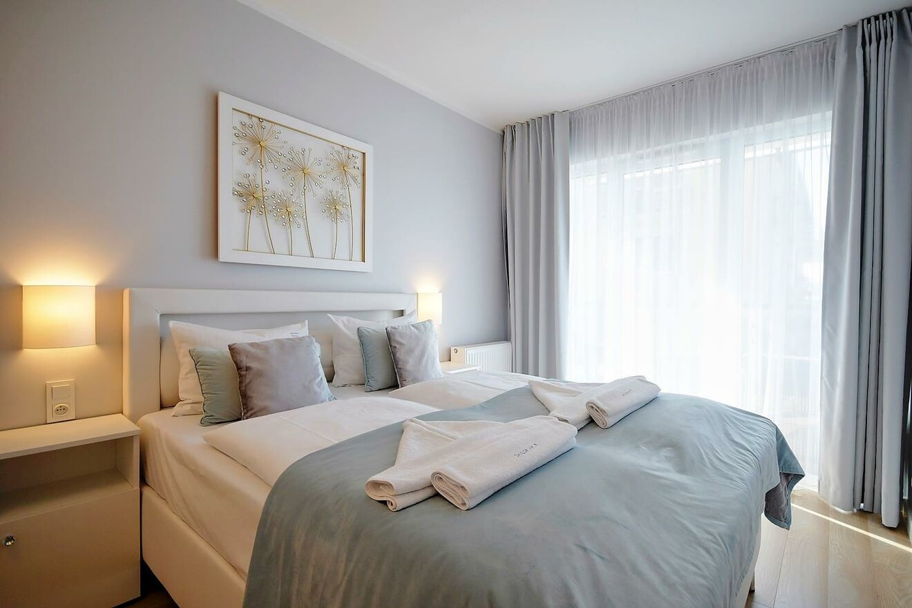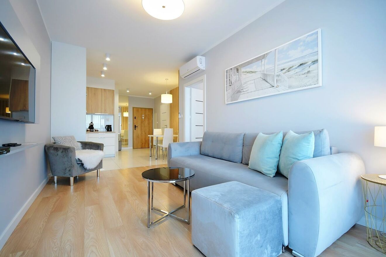 Wnętrze apartamentu zostało wykończone w wysokim standardzie, co nadaje mu elegancji i funkcjonalności. W dwóch pokojach znajduje się klimatyzacja, co zapewnia komfort w gorące dni.